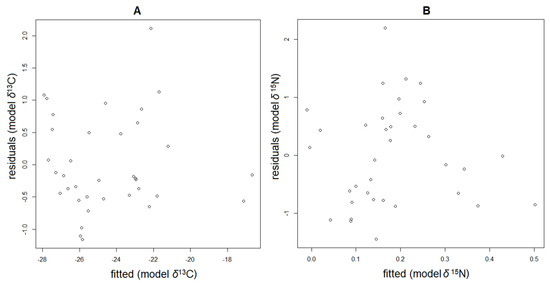 Plots of residuals vs. predicted values for δ13CPOM (A) and δ15NPOM (B) models.