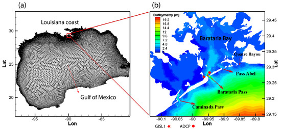 Barataria Bay (Figure 1) is a shallow estuary in southeast Louisiana and south of the City of New Orleans. It is bounded by several barrier islands and irregular-shaped wetlands with multiple tidal inlets connecting to the open ocean. The main axis from north to south and from east to west is about 30–40 km. The tidal inlets include Barataria Pass with a width of ~800 m and a maximum depth of 20 m at the mouth, Caminada Pass with ~800 m width, 9 m depth, and a 90 degree turn in channel orientation near the mouth, and the 15 m deep Pass Abel with a width of about 1.9 km. Freshwater is mainly from the manmade Davis Pond Diversion facility with a capacity of about 250 m3/s of flux. Water inside the Barataria Bay is very shallow (average depth of 2 m). Erosions in the bay appear to be significant, e.g., there is a 50 m hole [50] northwest of the Barataria Pass, which is the deepest point among all Louisiana lagoons, bays, and estuaries, revealing the significant contribution of non-tidal forcing to the micro-tidal system.