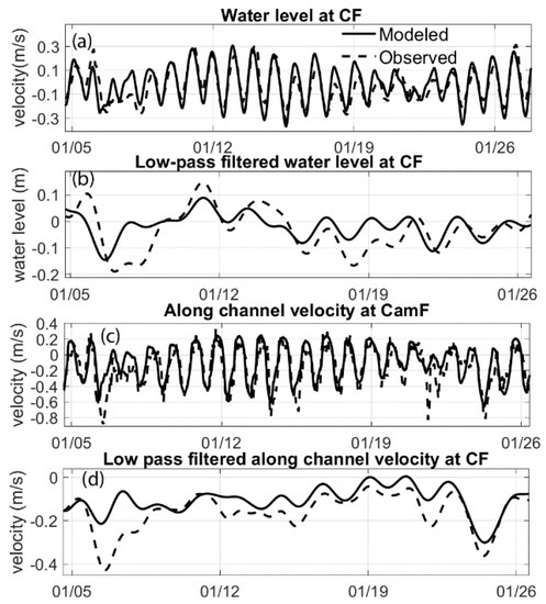 Validation of water level and along-channel velocity using observation in January 2014 at Caminada Pass, (a,c) are validations of water elevation and surface flow at Caminada Pass, (b,d) are validations of low-pass filtered water elevation and along channel velocity at Caminada Pass. Skill score for water level and along channel simulation are 0.7 and 0.67, which are categorized as “excellent”.