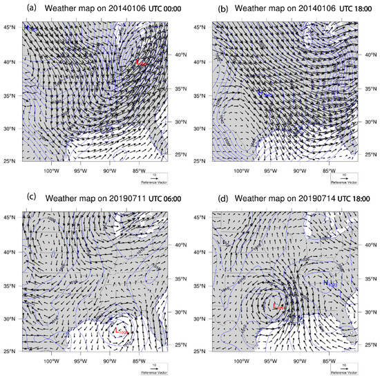 Weather maps during the cold front at 0000 UTC, 01/06 and 1800 UTC, 01/06, and during Hurricane Barry at 0600, 07/11 and 1800, 07/14. (a,b) are the weather maps before and after the cold front passage in January 2014, and (c,d) are weather maps before and after the landfall of Hurricane Barry. Blue lines are contours of air pressure.