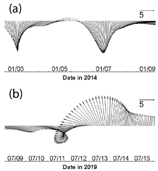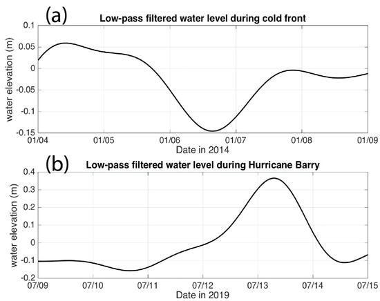 Low-pass filtered water level variations during cold front and hurricane are shown in Figure 5a,b, respectively. Water level dropped about 15 cm after the cold front passage during northerly wind, so that one can see an obvious trough at 1500 UTC on 6 January. This is because northerly wind after the cold front passage continuously blew the water out of the bay, leading to the water level minimum. As northerly wind weakened, water level begun to rise. On the other hand, when the water level was under the influence of Hurricane Barry, it is found that there was a surge of 40 cm after the hurricane’s landfall, when wind also reached the maximum of 14.5 m/s. The surge resulted from the southerly wind after Barry’s landfall, which blew the water from the coastal ocean into the bay. Compared with the trough induced by the cold front, the surge caused by Hurricane Barry is about 3 times larger in terms of magnitude.