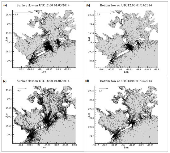 Figure 6 shows the surface (Figure 6a) and bottom (Figure 6b) flows at 1200 UTC on 5 January 2014 before cold front passage when southerly wind dominated (with maximum magnitude of about 3 m/s). Flows inside the bay were in the wind’s direction, flowing from south to north. Shallower and surface water had a larger magnitude of flows. Surface and bottom flows were unidirectional, while surface flow had a larger magnitude. After the cold front’s passage (Figure 6c,d), when northerly wind dominated (maximum magnitude of 13.5 m/s), flows inside the bay were also in the direction of the wind, flowing from north to south. However, there existed a strong return flow in the middle of the bay where it had a greater water depth, which is consistent with previous studies in many systems: currents for shallower water tends to move in the direction of wind, whereas against the wind’s direction for the region with a greater water depth (e.g., [49,56]). Again, surface and bottom flows were mostly uniform, except that surface flow had a larger magnitude. This is because bottom flow is decreased by bottom friction.