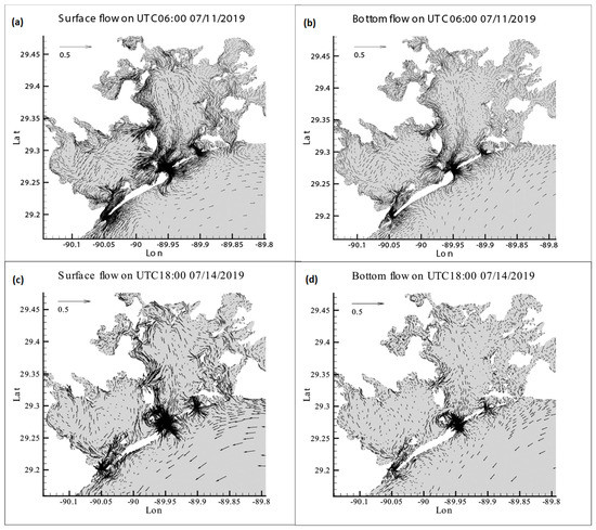 Surface and bottom flows under Hurricane Barry in 2019. (a,b) are surface and bottom flows on 0600 UTC, 11 July 2019; (c,d) are surface and bottom flows on 1800 UTC, 14 July 2019.