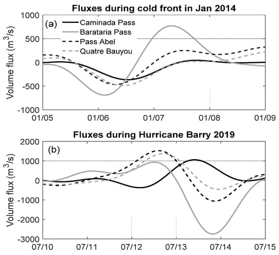 During Hurricane Barry, wind changed direction from the northern quadrants to southern quadrants. Therefore, the volume flux changed its sign after Barry’s landfall on 13 July 2019, flowing into the bay through Barataria Pass, Pass Abel, and Quatre Bayou at first, then flowing out of the bay through these inlets afterwards. Note that Caminada Pass had the opposite condition: water was flowing out of the bay and then into the bay after Barry’s landfall. This pattern is not included in any mode in cold front-induced flows [50]. Obviously, the mode of hurricane-induced flows can be different from that due to cold fronts. Before Barry’s landfall, Pass Abel had the largest inward flux under northerly wind, and after Barry’s landfall, Barataria Pass had the largest outward flux with a magnitude reaching 2500 m3/s, which was about 4 times of that induced by the cold front.