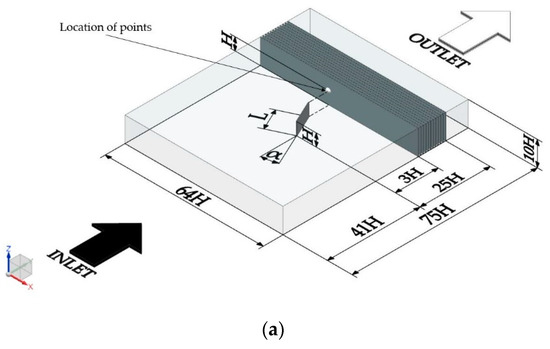 The computational domain consists of a block with a rectangular VG located on its lower surface. The height of the VG (H) is equal to 0.25 m and the length (L) is twice its height. Two different incident angles (α) are considered, 18° and 25°. The lower surface of the block and the surfaces of the VG are considered walls with no-slip conditions, the upstream part of the domain is set as inlet and the downstream part of the domain is set as outlet. The rest of the surfaces are considered symmetry planes, in order not to affect the flow. The computational domain and the distance from the inlet to the VG position were designed in order to have the boundary layer thickness (δ) at the VG position equal to the height of the VG (δ = H). More information about the computational domain is shown in Figure 1.