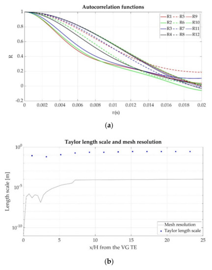 Verification of sufficient mesh resolution for LES was performed based on the criterion stablished by Kuczaj et al. [27]. According to their study, the mesh resolution () should at least be in order of the Taylor length-scale (λ) to completely solve the Taylor length-scale. Taylor length-scale is obtained from the Taylor expansion coefficient of the autocorrelation function about the origin. The autocorrelation function defines the relation between data samples in a time series, on average, to the preceding data points. This function is useful to analyze how turbulent a flow is. The more turbulent the flow, the lower the relationship between the data. Consequently, the auto-correlation function will approach zero faster. From the autocorrelation function, the Taylor time-scale is calculated, and finally, the Taylor length-scale is estimated by the Taylor hypothesis [28]. For more information about the Taylor length-scale calculation process, check [27,29]. This method has been applied in the previously-mentioned 12 points. The autocorrelation functions of different points are shown in Figure 3a and the comparison between the Taylor length-scale and mesh resolution is plotted in Figure 3b.