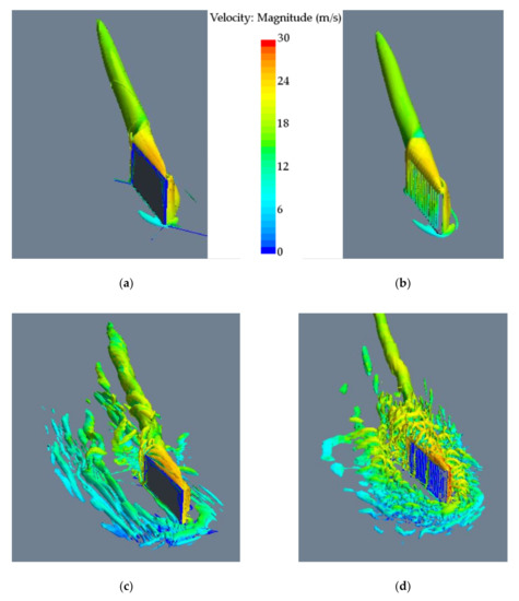 Isosurfaces colored by velocity: (a) Reynolds-Averaged Navier-Stokes (RANS) Fully-Resolved Mesh (α = 18°); (b) RANS Cell-Set Model (α = 18°); (c) LES Fully-Resolved Mesh (α = 25°); (d) LES Cell-Set Model (α = 25°).