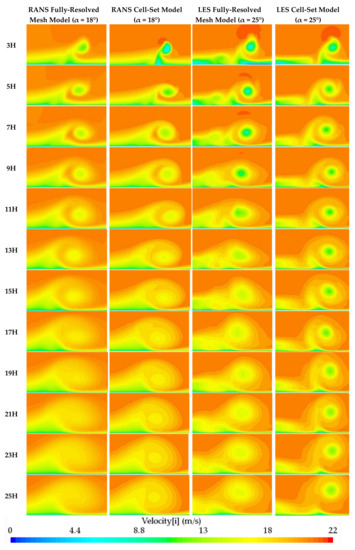 To analyze the vortexes, the axial velocity of the flow in the previously-mentioned 12 spanwise planes is considered. In RANS simulations, the instantaneous values are considered, whereas in LES simulations, the mean values of 2 s after the flow are fully developed. Figure 6 displays the axial velocities.