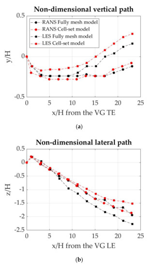 Despite being similar in shape, the displacement of the primary vortex from the VG is not equal with both models. Hence, the position and trajectory of the primary vortex is studied. Figure 7 shows the vertical (Figure 7a) and lateral (Figure 7b) displacement of the center of the primary vortex (the point where the peak vorticity appears).