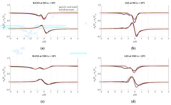 In RANS, simulations almost equal to velocity profiles are obtained in the analyzed planes. In LES, though, despite obtaining similar results near the VG, bigger values of the velocity are obtained with the cell-set model, especially far away from the VG. However, the differences are relatively small, and the trend is almost the same.