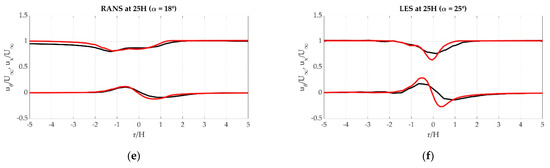 Normalized axial (upper) and azimuthal (lower) velocity profiles: (a) RANS at 5H from the VG Leading Edge; (b) LES at 5H; (c) RANS at 15H; (d) LES at 15H; (e) RANS at 25H; (f) LES at 25H.