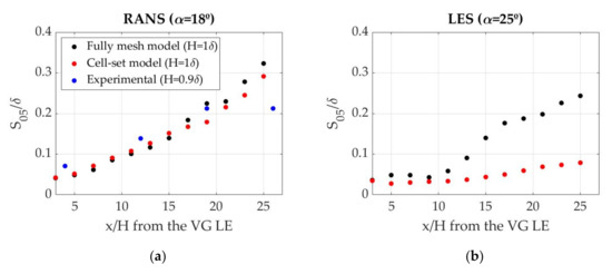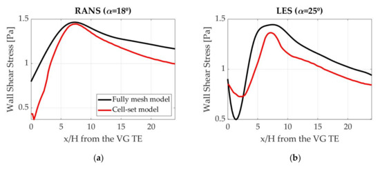 With both RANS and LES, accurate predictions of the location of the wall shear stress maximum value are obtained using the cell-set model, but the values are different. With RANS, the maximum values are nearly equal, but as the flow distances from the VG, the differences increase. With LES, in spite of following the same trend, the values are slightly lower in all the locations. These differences in values can be attributed to the displacement of the primary vortex, since the greater the displacement, the smaller the influence of the vortex behind the VG; and this leads to lower values of the wall shear stress. With both models, larger wall shear stress values are obtained when α = 18°. Since Godard and Stanislas [38] showed that the maximum skin friction appears when the angle of attack is near to 18°, these results were expected.