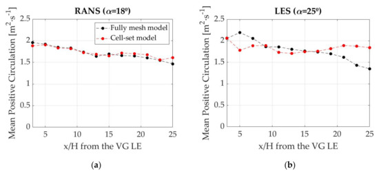 As shown in the coherent structures, with LES, the primary vortex with the cell-set model is much longer than with the fully-resolved mesh model. This means that the vorticity is bigger and has resulted in larger values of the mean positive circulation far away from the VG. In addition, the values remain nearly constant, and therefore, barely diminish. In RANS, very small differences between models are found.