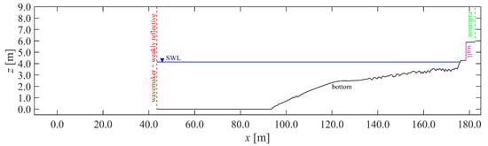 Definition of the DSPH 2DV computational domain, with coloured indication of the model fixed and movable boundaries. The still water level (SWL) is indicated in blue (z = 4.14 m). Note: The axes are in a distorted scale.
