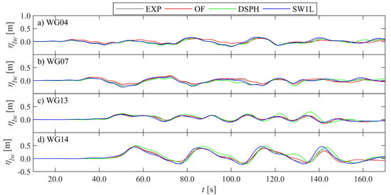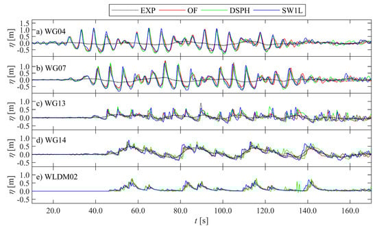 From these figures, it is immediately clear that all three numerical models provide results that are very close to EXP. Especially for η, differences appear to be very small with more significant differences in the surf zone (Figure 4c,d) and on top of the dike (Figure 4e). Further differences are revealed when comparing the η time series of the LW components only. OF does not correspond as well to EXP in the offshore zone (Figure 5a) compared to the other two numerical models. In the surf zone, however, OF shows better correspondence to EXP together with SW1L, while DSPH starts to diverge more from EXP for t greater than approximately 120 s (Figure 5c,d).