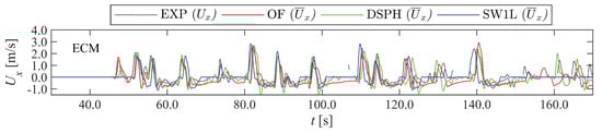 Comparison of the Ux time series at the ECM location. The zero-reference is the promenade bottom. Adapted from the work in [3], with permission from the authors, 2020.