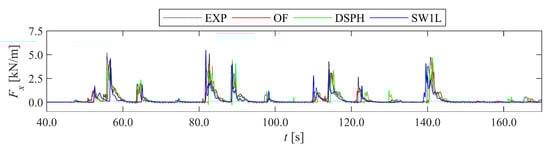 Comparison of the Fx time series at the vertical wall. The experiment is the load cell force measurement. Adapted from the work in [3], with permission from the authors, 2020.