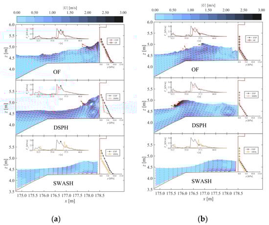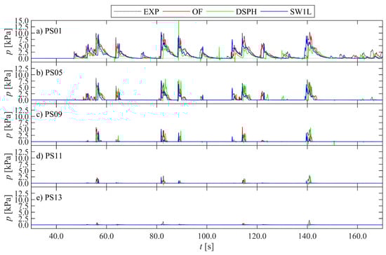 For the Fx (Figure 7) and p time series (Figure 8), differences become more distinctive. DSPH shows (small) negative or sub-atmospheric p peaks, not observed in EXP, that occur before some of the dynamic impact peaks and mostly for the lowest PSs (Figure 8a). Both OF and DSPH appear to underestimate most peak values for both Fx and p, while phase differences with EXP are most apparent for DSPH and SW1L.