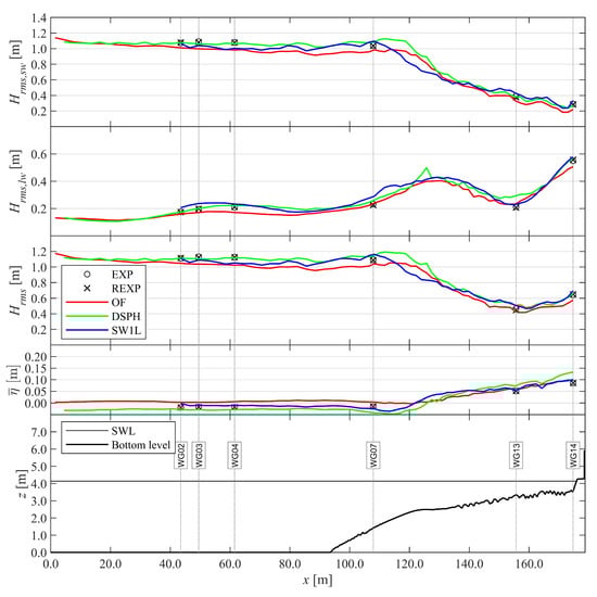 The evolution of the root mean square wave height Hrms, the SW and LW components (i.e., Hrms,sw and Hrms,lw), and the mean surface elevation (wave setup) over the wave flume up to the toe of the dike are compared in Figure 9. All models agree on the general evolution of the Hrms curves along the flume. The wave height slightly decreases from the wave paddle up to the toe of the foreshore, more so in case of OF than DSPH (with DSPH closest to EXP): from the wave paddle location to the foreshore toe, Hrms decreases about 10% more for OF than DSPH. SW1L shows a similar behaviour from its offshore boundary (i.e., at WG02) until the foreshore toe and corresponds most with DSPH. On the other hand, SW shoaling is overestimated by both DSPH and SW1L (Hrms,sw at WG07 in Figure 9). In the surf zone, DSPH reproduces the energy loss due to SW breaking best of all three numerical models (i.e., closest result to (R)EXP for Hrms,sw at WG13 and WG14 in Figure 9), while SW1L overestimates and OF underestimates Hrms,sw there.
