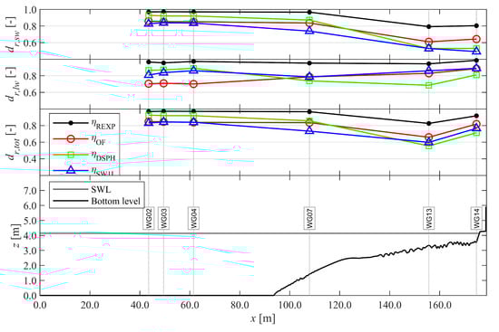 Comparison of dr, evaluated for REXP, OF, DSPH and SW1L with reference to EXP, up to the toe of the dike. From top to bottom: dr,sw for ηSW, dr,lw for ηLW, dr,tot for η, and finally an overview of the sensor locations, SWL, and bottom profile. Adapted from the work in [3], with permission from the authors, 2020.