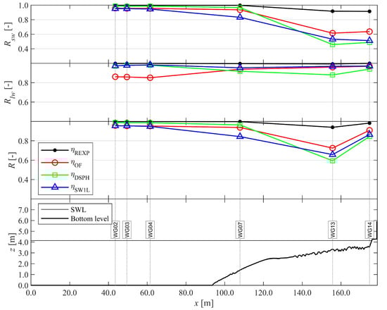 Comparison of R evaluated for η (of REXP, OF, DSPH and SW1L with reference to EXP) up to the dike toe. From top to bottom: Rsw for ηSW, Rlw for ηLW, R for η, and finally an overview of the sensor locations, SWL, and bottom profile. Adapted from the work in [3], with permission from the authors, 2020.