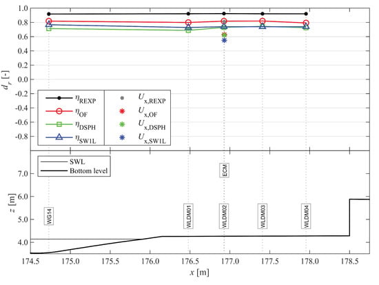 More than a qualitative validation and evaluation of inter-model performance is not possible with the time series comparison of Section 3.1, especially when visually almost no discernible and consistent trends of distinction between the model results can be made. The model performance and pattern statistics, provided in Appendix B and Section 2.4, then become very useful for a quantitative evaluation. As dr provides a single dimensionless measure of average error, it is suitable to provide insight into the spatial variation of model error in the flume. In addition to the dr of each numerical model, the dr of the repeated experiment (REXP) is also included in this analysis. A numerical model dr higher than the dr of REXP means that the numerical error cannot be reduced further compared to the experimental repeatability error and a near “perfect” model performance would be achieved with regard to the experiment [3]. Therefore, a relative refined index of agreement d’r (Equation (A8)) and a corresponding rating (Table A1) was defined by Gruwez et al. [3] which provides the performance of the numerical model relative to the experimental model uncertainty. Table 2 and Table 3 provide the dr-values and the pattern statistics at key locations (dike toe and on the promenade, respectively). It is noted that the statistics for η reported in Table 3 were averaged over the four measured locations (WLDM01—WLDM04), for the sake of brevity and because it better represents the statistics for the processes on the promenade. The evolution of dr and R at the WG locations along the wave flume up to the toe of the dike is shown, respectively, in Figure 10 and Figure 11, for ηSW (dr,sw and Rsw), for ηLW (dr,lw and Rlw) and for η (dr,tot and R), and of dr for η and Ux on the dike in Figure 12.