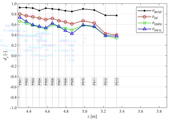 Next the dr-values of the pressures at the vertical wall are compared in Figure 13 and the statistics in Table 4. Again, all models show a lower model performance than REXP, and OF obtained the highest value followed by SW1L and DSPH, both of which have very similar model performance along the PS array. Model performances of all models tend to decrease and converge to each other towards higher sensor locations on the vertical wall.