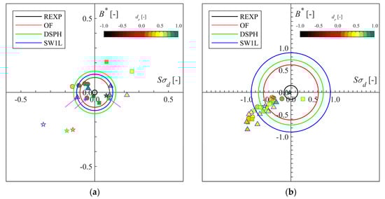 In the η skill target diagram, the numerical model skill for the location on the dike is indicated by an arrow. The remaining numerical model skill scores are those of the measured locations along the flume up to the dike toe. For OF, they are positioned in the top left quadrant, which means that the wave energy is underestimated ( < 0) and the wave setup is slightly overestimated (B* > 0) (both confirmed by Figure 9). For DSPH, the wave energy is mostly overestimated ( > 0). The two points furthest removed from the origin are the measured locations in the surf zone (i.e., WG13-14), where high B* and low R-values (or wave phase differences) are the largest contributors to the decreased DSPH model skill in this area. SW1L generally shows an overestimation of the wave energy ( > 0) and increased wave phase differences (lower R) in the shoaling and surf zones. Generally, SW1L has the best wave setup results (lowest B* values). The Ux skill of all numerical models is one of a clear underestimation (pentagrams in lower left quadrant), of both the mean value (B* < 0) and standard deviation ( < 0), and increased phase difference (low R-values). The same is valid for p and Fx, where all numerical model skill points are also positioned in the lower left quadrant.