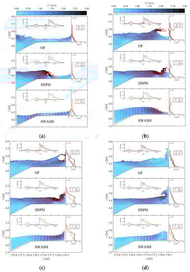 The pattern statistics B* and in Table 2 represent, respectively, the accuracy of the wave setup and wave amplitude at the toe of the dike [3], and spatial information of these errors could already be derived implicitly from the and Hrms graphs in Figure 9. Both were already discussed in Section 3.2. The result is that at the toe of the dike, DSPH has the best result of the three numerical models in terms of reproduction of the wave height (Table 2, = 1.02), but the worst result in terms of the wave setup (Table 2, B* = 0.21). OF has the worst result for the wave height (Table 2, = 0.89), while delivering a close second-best result with SW1L for the wave setup (Table 2, B* = 0.05). SW1L provides the lowest wave setup error (Table 2, B* = 0.04).