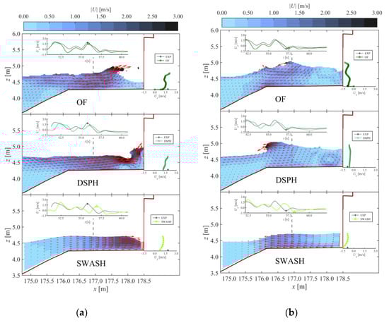 On top of the dike, the dr of Ux is provided in Figure 12 and Table 3, and indicates a lower model performance for all three numerical models than obtained for η. However, for the relative model performance d’r this difference significantly reduces, so that the same rating is obtained for Ux as for η in case of DSPH and OF (Table 3, rated Very Good). SW1L (and SW8L) has the lowest d’r for Ux and rating (Table 3, rated Good). Although the wave setup at the dike toe is overestimated by each numerical model (Table 2, B* > 0), η on the promenade is generally underestimated and Ux as well (Table 3, B* < 0). The bore wave height is best represented by OF (indicated by ), closely followed by DSPH and SW1L. Phase differences are observed for all numerical models (i.e., R < 1.00 in Table 3), but are lowest for OF, followed by DSPH and SW1L.