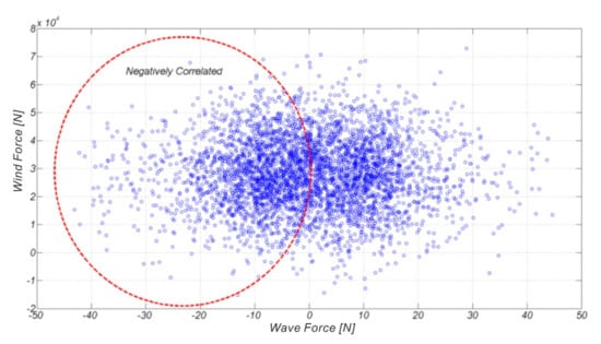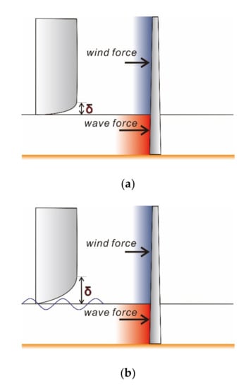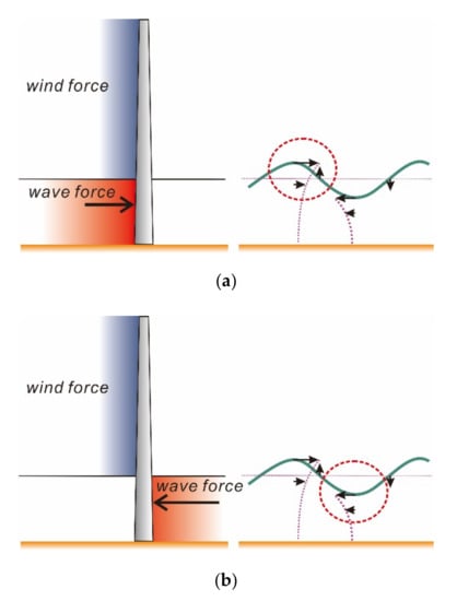 Second, even when waves approach offshore wind energy converters in the same direction as the wind, the waves and wind loads do not always make the offshore wind energy converter deflected; these environmental loads can even intermittently exert a resistance force against deflection. This resisting force occurs when the wave force reverses its direction when the water surface turns into a trough, which results in the wave force acting in the opposite direction to that of the wind (see Figure 3).