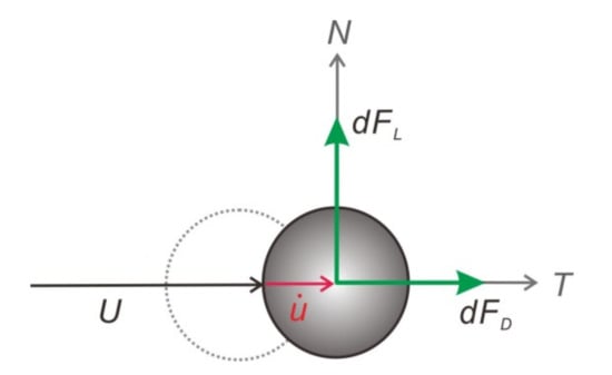 where is the hydrodynamic drag coefficient, is the inertia force coefficient, is the density of water, and are the water velocity and acceleration due to waves, respectively, and is a volume per unit length of the substructure [].