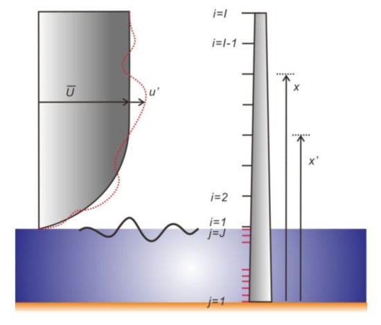 After discretizing the monopile of the offshore wind energy converter with I nodes (see Figure 5), the turbulent velocity components at each node can be written as using the cross spectral density function in Equation (11) and the self-spectral density function in Equation (12):