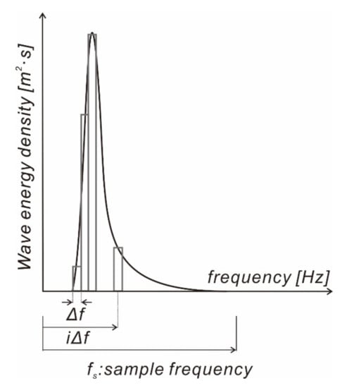 - Choose the sample frequency and the resolution of the spectrum (half the number of Fourier components) . This yields a frequency domain resolution of . The discrete wave energy spectrum can be written as (see Figure 7):Figure 7. Partition of target wave spectrum.