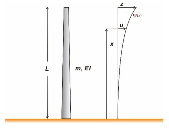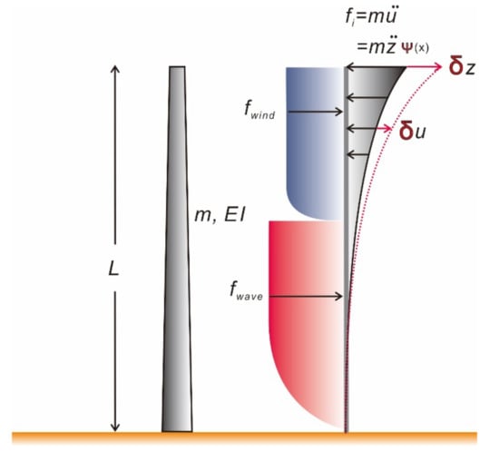 If the structure is slender like the monopile as a substructure of the offshore wind energy converter, among many structural member forces, the bending moment dominates. Following D’Alembert, the inertial force resulting from the deflection could be regarded as a kind of external force (see Figure 8). This external force is then balanced by the resistance bending moment that develops in the structural member. From the principle of virtual work (see Figure 9), we can obtain the following equation of motion []: