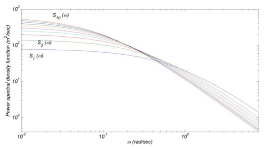 The weather conditions are classified as mild or storm and can be described in terms of the wind speed averaged over 10 min, the shear stress, and the turbulence intensity . Here, the shear stress is defined as the gradient of the vertical profile of longitudinal wind velocity, and the turbulence intensity is defined as the standard deviation of the wind velocity around its mean value, based on the assumption that the wind velocity is sustained to be steady-state over a short period of about 10 min. The moderate wind is used to analyze the offshore wind energy converter’s fatigue behavior, and the storm is used as a design load for the offshore wind energy converter []. Because the wind over the short temporal and spatial domain of the limited scope is closely correlated, a numerical simulation of the turbulent wind velocity components along the offshore wind energy converter [] has been implemented using the cross-spectrum. For the sake of self-containment, the numerical simulation procedure of instantaneous turbulent wind velocity using the cross-spectrum can be summarized as:
