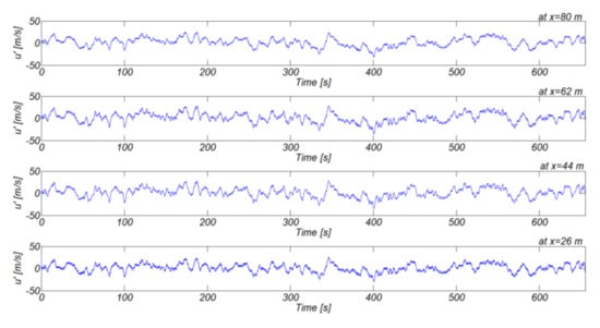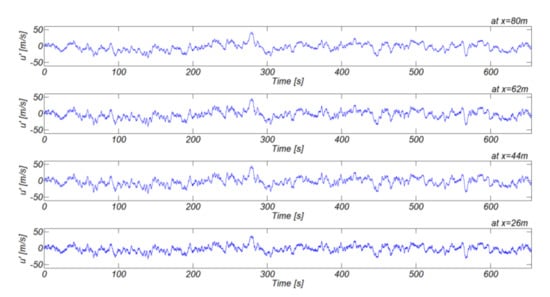 Time series for numerically simulated turbulent wind velocities at x = 80, 62, 44, and 26 m [rough sea].