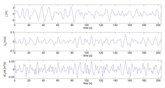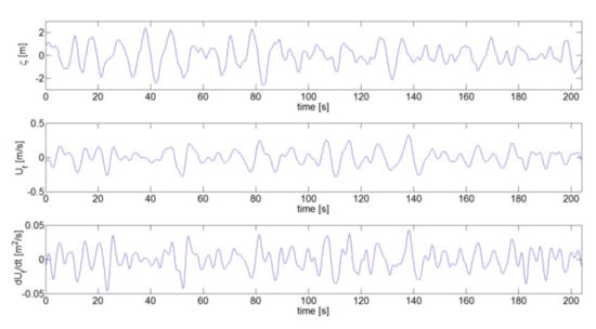 Numerically simulated water surface displacement, velocity, and acceleration at x = 17.5 m for Hs = 5 m, and Tp = 10 s.