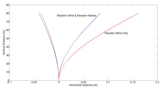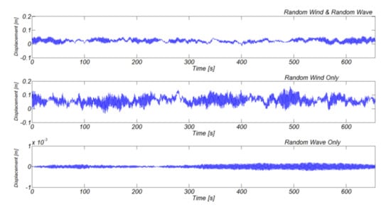 Table 2 summarizes the wave and wind conditions used for the numerical simulation. Figure 16 depicts the numerically simulated responses of the substructure of the offshore wind energy converter against various combinations of environmental loads. First, the numerical simulation was implemented for the case where the wind and wave load act simultaneously. The numerical simulation was then carried out for the case where only random wind is present. The upper panel corresponds to the case where the random wind and random wave loads act simultaneously, and the lower panel corresponds to the case where only random wind blows. When only random wind blows, the substructure’s response significantly increases. Figure 17 depicts the snapshots of the substructure of the converter when the deflection reaches its maxima. When the deflection reaches its maxima, the maximum displacement for the converter’s substructure is observed as [0.0845 m, −0.0401 m] for RUN1 and [0.1616 m, 0.0359 m] for RUN2.