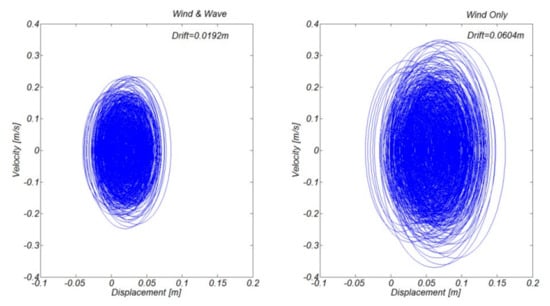 In Figure 18, we plot the trajectories left behind by the substructure of the offshore wind energy converter in the phase space made with the velocity and the deformation. Here, it is shown that the amplitude of the trajectory significantly decreases along with the stabilizing effect of the waves when compared to the case where only random wind blows. Furthermore, the attractor was shown to move toward the direction of the wind, and these trends are more apparent for the case where only random wind blows. These phenomena are partially caused by the assumption that the mean wind velocity remains unchanged during the numerical simulation, but the deflection can be deduced to be significantly controlled by wavy motions at the water surface occurring as the wind blows. These waves’ stabilizing effects result from the bumpy water surface due to the presence of waves as the wind blows, which then generates a series of hairpin vortices. Later, each hairpin vortex’s solenoidal effects result in the formation of a large eddy circulating in the direction opposite to the incoming wind near the atmospheric boundary layer []. As a result, the vertical distribution of the longitudinal wind velocity is modified, and the accompanying energy loss drastically weakens the wind velocity, resulting in less deflection of the converter. In addition to the large eddy mentioned above, a reversal in the wave force’s direction in the third and fourth quadrants also contributes to the waves’ stabilizing effects.