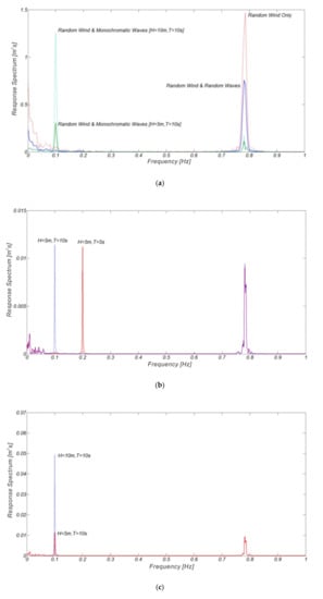 Response spectrum of the offshore wind turbine substructure against different combinations of external forces (a) comparison of response spectrum against varying environmental loads and (b) against turbulent wind and monochromatic waves with varying wave period, and (c) against turbulent wind and monochromatic waves with varying wave height.