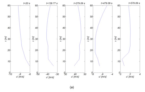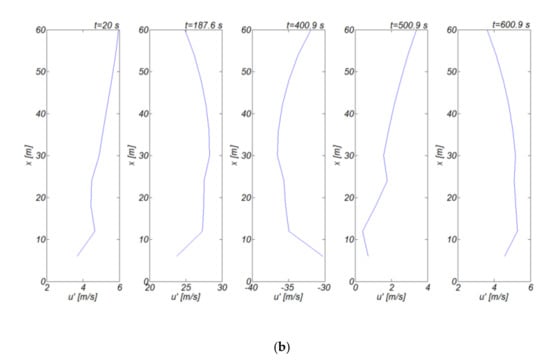 Vertical profile of randomly fluctuating wind velocity component at varying instants (a) calm seas and (b) rough seas.