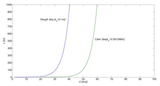 where is the reference wind velocity that is usually taken as the mean velocity at a height of 10 m, and is the roughness height. Under stormy weather conditions in open seas with at a 10 m height that ranges from 10 to 20 m/s, the roughness height is known to have a value of 1–10 cm []. is irregular due to the variability inherent in the marine environment [,,] and is known to follow a Weibull distribution, which can be written as: