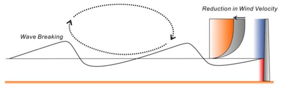 First, an atmospheric boundary layer near the water surface grows nonuniformly as the water surface fluctuates when the wind blows. Then, the bumpy water surface generates a series of hairpin vortices. Later, each hairpin vortex’s solenoidal effects are added, leading to the formation of a large eddy circulating in the direction opposite to the incoming wind near the atmospheric boundary layer []. As a result, the vertical profile of the longitudinal wind velocity is modified, and the subsequent energy loss decreases the wind load on the offshore wind energy converter (see Figure 1 and Figure 2).