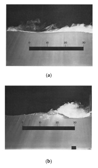 Smoke visualization for the air flow over (a) a broken finite amplitude water wave and (b) a breaking water wave. The superimposed scale is in cm. The air flow is from left to right with U0 = 0.9 m/s. Smoke was introduced continuously at the far-right hand side (reproduced from Banner, and Melville []).
