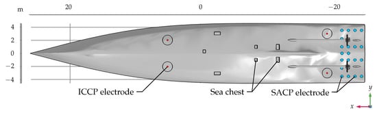 The generic ship model has a length of 50 m, a width of 9 m and a draught of 4 m and is equipped with a four-zone ICCP system. Additionally, an SACP is installed inside the sea chests and the stern region of the ship, which are represented by circular patches with a diameter of 40 cm. The benefit of combining the ICCP with the SACP system is to smoothen the electric potential distribution over the hull, while ensuring the corrosion protection condition with lower ICCP currents. However, due to the strong gradients of the electric potential in close vicinity to the ICCP electrodes, a circular electric insulation with a diameter of 1.5 m is positioned around each electrode to prevent overprotection in said regions. For further clarification, the ship model is depicted in Figure 1.