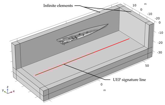 Numerical setup including water domain and seabed domain within COMSOL Multiphysics to calculate the underwater electric potential (UEP) signature of the generic ship model. For extracting the electric signature of the vessel a UEP signature line is positioned midship 20 m below the keel. Additionally, all boundaries except the top layer are surrounded by infinite elements to account for a virtually infinite region.