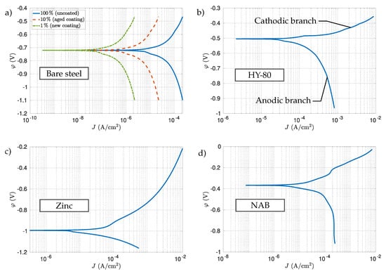 Polarization curves defined as electric potential over electric current density J for the subfiguresv (a–d) are used as boundary conditions for the numerical ship model in COMSOL. The polarization curve can be separated into the cathodic branch and the anodic branch as depicted in (b), with the former representing a positive current density pointing towards the material surface and the latter representing negative current densities flowing outside the material surface. The transition between both branches defines the equilibrium state, in which the number of oxidation and reduction reactions are equal. For the stated equilibrium the current density will be zero. All polarization data were taken from [] and were recalculated for an Ag/AgCl reference electrode when the reference electrode differed from the Ag/AgCl electrode. To account for a perforated coating a correspondingly weighted current density of the polarization curve is applied as can be seen in (a). As an example, 10% shall represent a hull coating with a homogeneous damage of 10%.