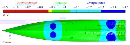 To find the necessary ICCP currents for corrosion protection the impressed currents are adjusted manually for all four ICCP electrodes until the corrosion protection condition is met. The appropriate corrosion protection potential was calculated for both bare steel and HY-80 steel using the corresponding German standard for corrosion protection of naval vessels []. In Figure 4 an exemplary electric surface potential distribution for bare steel is presented for corrosion protection of the full ship model. For the impressed currents of the bow electrodes, further described as for the portside electrode and for the starboard site, the current for both electrodes was set to and for the stern electrodes the values are set to . For the HY-80 steel the impressed currents needed to be significantly higher and a current of 35 A is needed for all four ICCP electrodes to fulfill the corrosion protection condition. Additionally, the UEP signature is extracted for corrosion protection and both, the impressed ICCP currents and the corresponding UEP signature for corrosion protection are used as a reference scenario for each hull material.
