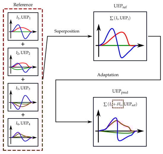 Here, the predicted UEP signature is calculated using the sum over i of all single UEP signature reference data generated by each ICCP electrode for the total number of ICCP electrodes N. The UEP signature , which was solely generated by the corrosion process can be extracted simulating the ship model with all ICCP currents set to 0 A (ICCP system is switched off) to isolate the corrosive reaction. When superimposing single UEP signatures the corrosion UEP signature would be taken into account N number of times in the shown formulation, due to the presence of the corrosion reaction when operating the ICCP system in a single electrode configuration, as well as operating multiple electrodes of the ICCP system simultaneously. Hence, the corrosion UEP signature is subtracted from each component in dependence of the number of electrodes and than added once to the equation to consider only a single UEP signature generated by the corrosion process. Furthermore, to predict the changes of the UEP signature for different ICCP currents the information of the present ICCP current at each ICCP electrode and the reference ICCP current are needed, with the latter being impressed to match the corrosion protection condition in the reference scenario. Therefore, only single UEP signatures generated by each ICCP electrode including the corresponding ICCP currents and the corrosion UEP signature, which can be extracted for a switched off ICCP system are needed for the UEP signature prediction. Hence, this prediction formulation is suitable for fast UEP signature prediction to estimate the detection risk of the vessel. Additionally, a schematic of the superposition principle used in this work is presented in Figure 5.